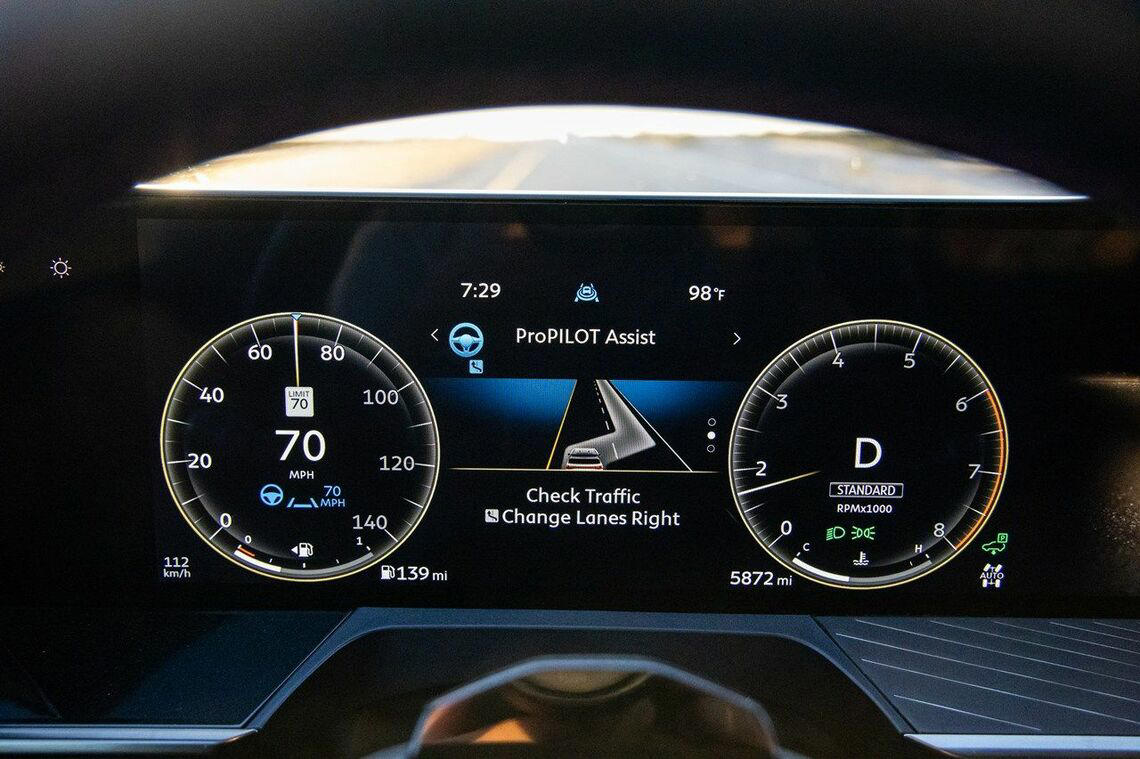 そして、最上級グレードである「AUTOGRAPH」には標準で装備される「ProPILOT Assist 2.1」のハンズオフアシスト制御も見事だった。先行車のスピードが遅い場合は、メーターやヘッドアップディスプレイを通して追い越しを提案され、ステアリングに備わるレーンチェンジスイッチを押して承認すると、車線変更と追い越し加速を自動で制御。広野の一本道をひたすら直進することの多いアメリカでは、これ以上なく助けになる機能だ。