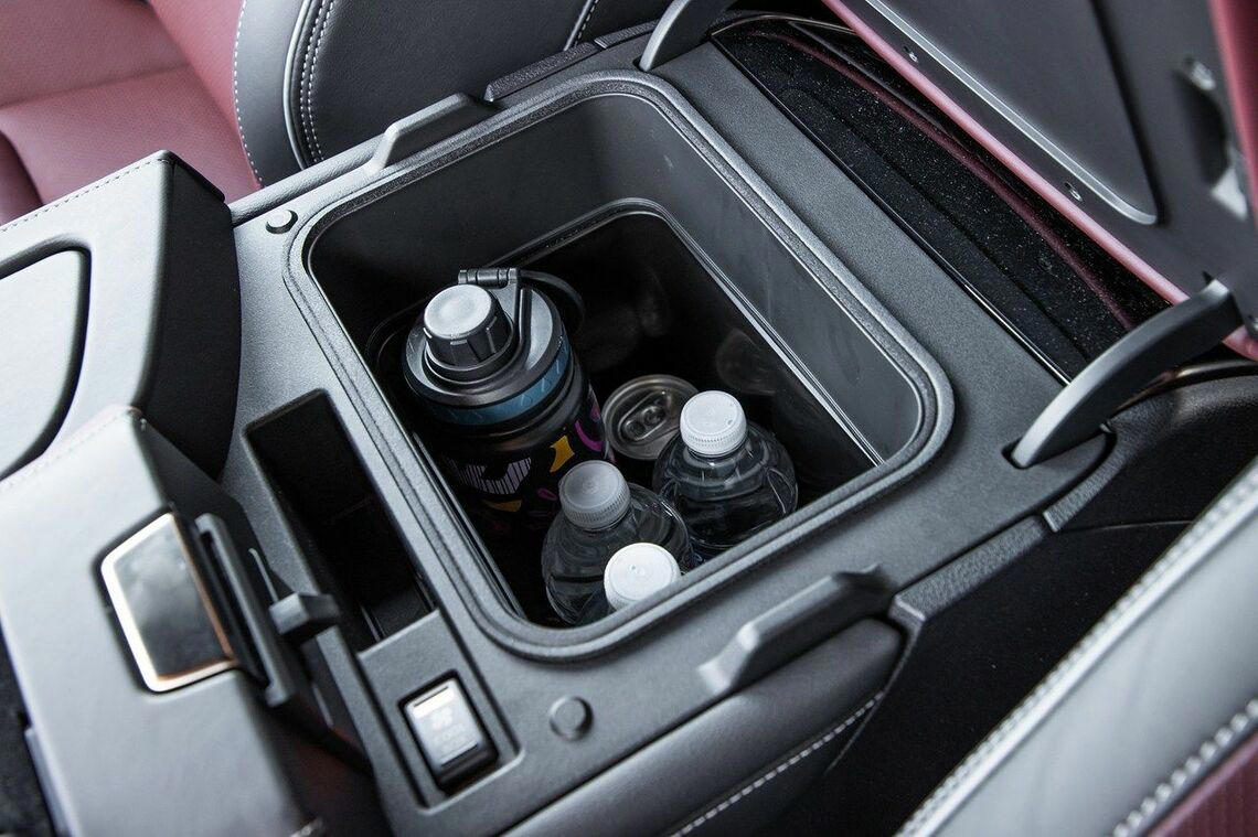 センターコンソールには9インチのタッチスクリーンが備わり、エアコン操作のほか、走行モードの切り替えや車高の上げ下げといった車両操作にも対応する。また、「AUTOGRAPH」にはアームレスト下に冷蔵庫も標準装備され、長い道中、飲み物をつねに適温で飲めたのはとても助かった。
