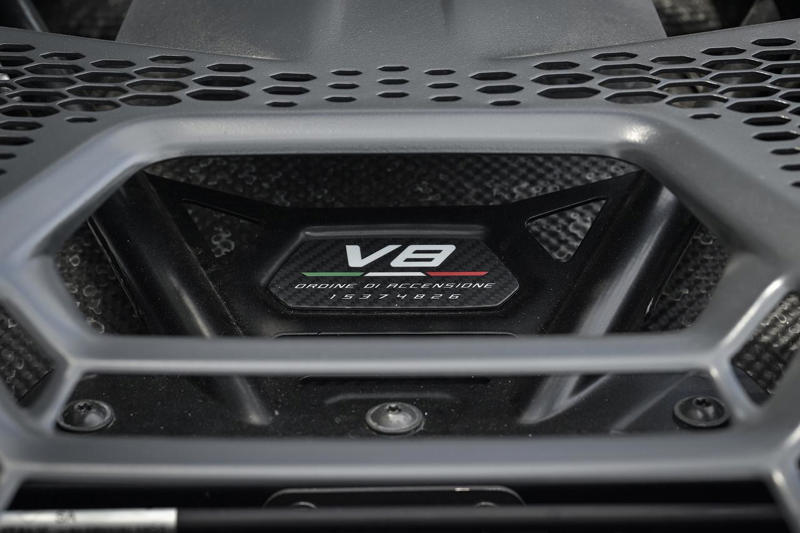 エンジン本体を眺めることはできない。ただしV8の文字の下にはイタリア語で「ORDINE DI ACCENSIONE(点火順序)」“15374826”と記されている。