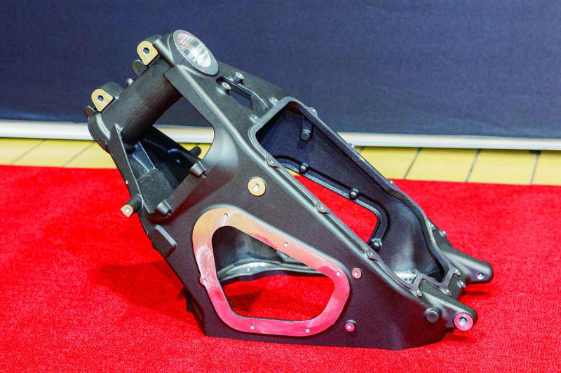 独自の車体構成の要となるモノコック構造のフロントフレーム。排気量890ccのバイクのフレームとは思えないほどコンパクトで、重量は4kgほど。エンジン上部に4本のボルトでマウントされ、エアボックスも兼ねる合理的なつくりを見せる。新型は横方向の剛性を大幅に落とすため、穴だらけの形状となった。写真はムルティストラーダV2用だが、パニガーレV2もほぼ同形状。