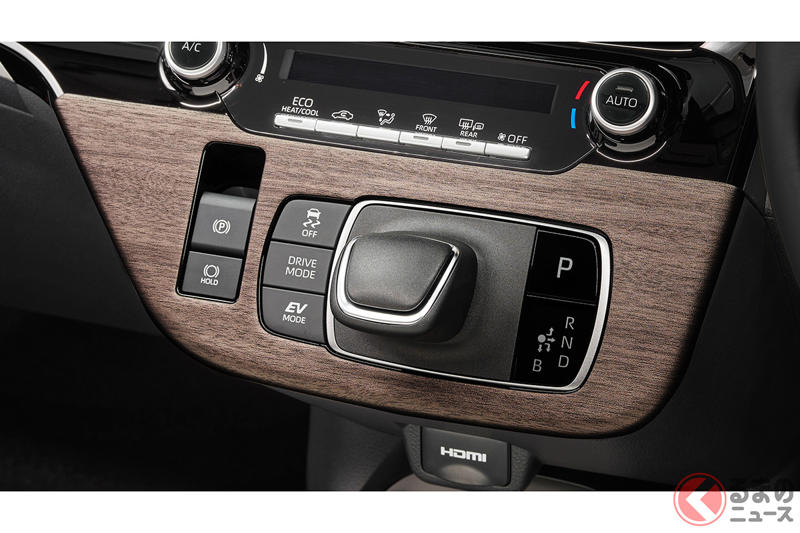 これはシフト周りのセンターパネル部と、左右ドアのパワーウインドウスイッチ部に備わるもので、それぞれ木目調の加飾が施されています。