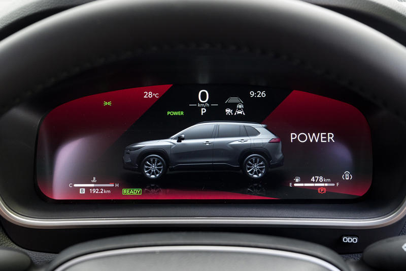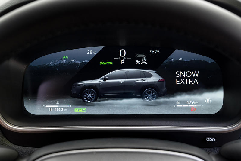 E-Fourは後軸側のモーターが2023年の一部改良時に最高出力41PS/最大トルク84N・mと初出時より大幅に強化されたが、注意深く観察すれば後ろ脚が蹴っている様子がみてとれるくらいの感触だ。でもインジケーターで見る限り、「ノーマル」モードでも頻繁に駆動を介入させているし、「スポーツ」モードでは明確に後軸側の蹴り出し感が強くなる。これがカローラ クロスの走りの洗練度をぐっと高めた一因であることは間違いない。もちろんスノーエクストラモードを用いるような低ミュー環境ではがぜん存在感を増すことになるだろう。