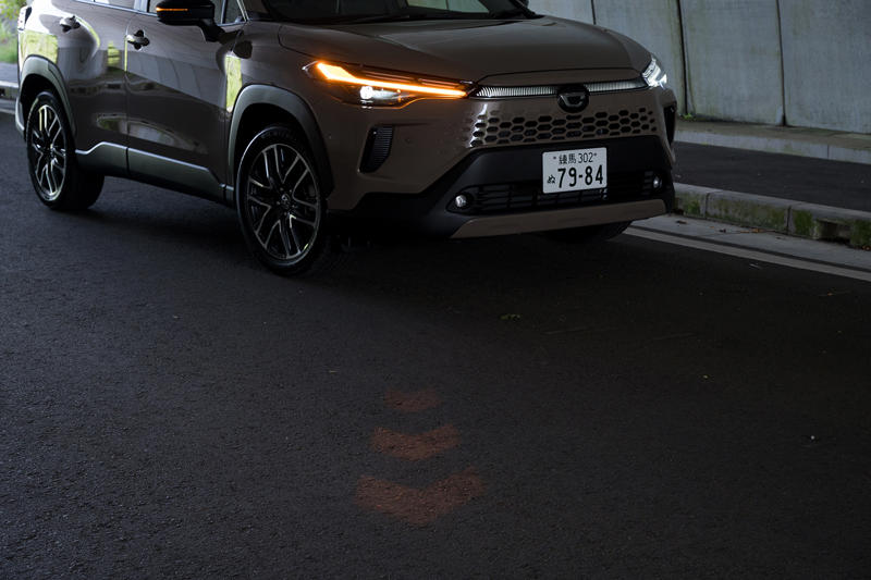 ADASまわりで興味深いのは「シグナルロードプロジェクション(SRP)」の日本初採用だ。これはウインカーやハザードの作動と連動し、前方路面に向けて注意喚起のシェブロンを投影するもので、夕暮れや夜間に歩行者や自転車への認識性を高めることでの事故抑制を狙いとしている。さすがに晴れた日中は厳しいものの、薄明るいトンネルや屋内駐車場でも認識できる光量は確保されているため、出合い頭の衝突回避の一助にはなりそうだ。それにこういう装備は、カローラ クロスのように数が出てさまざまなスキルの方が乗るクルマに搭載されるほうがより効果を期待できそうだ。