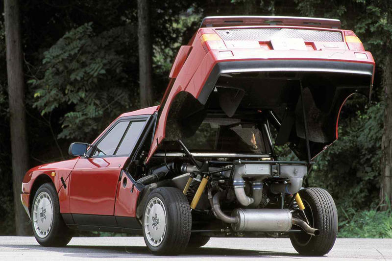 ミッドシップ搭載されるエンジンは、KKK製のターボチャージャーとアバルト製のスーパーチャージャーというダブル過給システムを備えた1759ccの直4DOHC 16バルブ。これは当時の規定で、過給器係数の1.4をかけても排気量を2500cc以下に収めなければならなかったからだ。また、それぞれの過給器用にインタークーラーも2つ備えられていた。