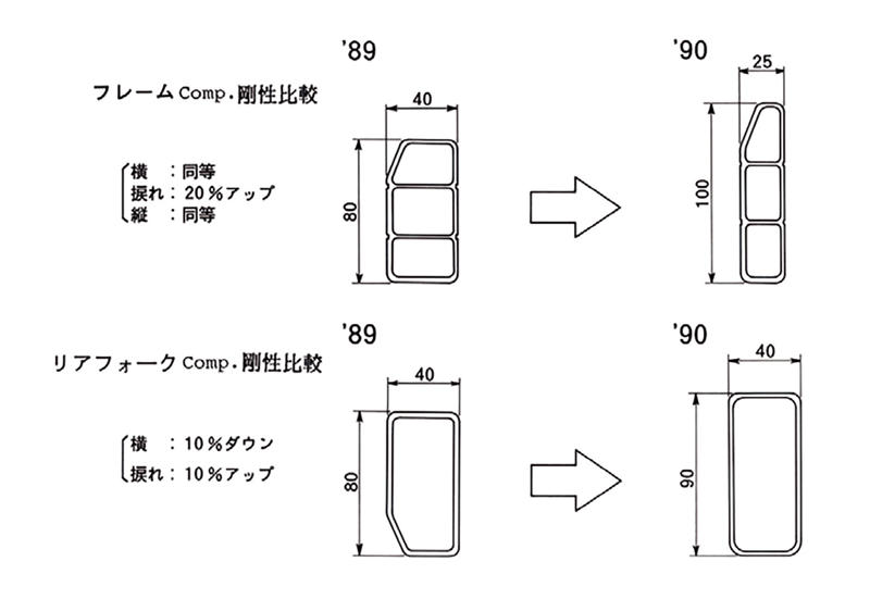 車体まわりは、ヘッドライトは薄型幅広の異型角型二灯となりシートカウル形状も変更。90年4月にはSPモデルが発売され、乾式クラッチ、マグネシウムホイール、フロントフォークプリロードと伸び側減衰の調整機構を採用。カウルの右下には乾式クラッチの冷却用にダクトを追加した。